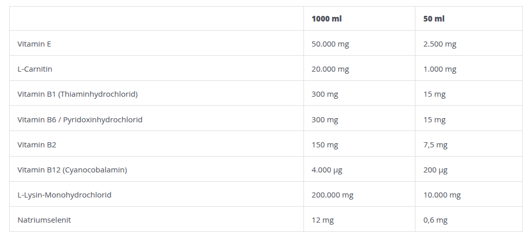 Dieses Ergänzungsfuttermittel enthält eine hochkonzentrierte Kombination aus Vitamin E, Selen, L-Carnitin, Lysin sowie Vitaminen des B-Komplexes (B1, B2, B6, B12). Es wurde speziell entwickelt, um die optimale Muskelfunktion, Leistungsfähigkeit und Geweberegeneration von Pferden zu unterstützen.